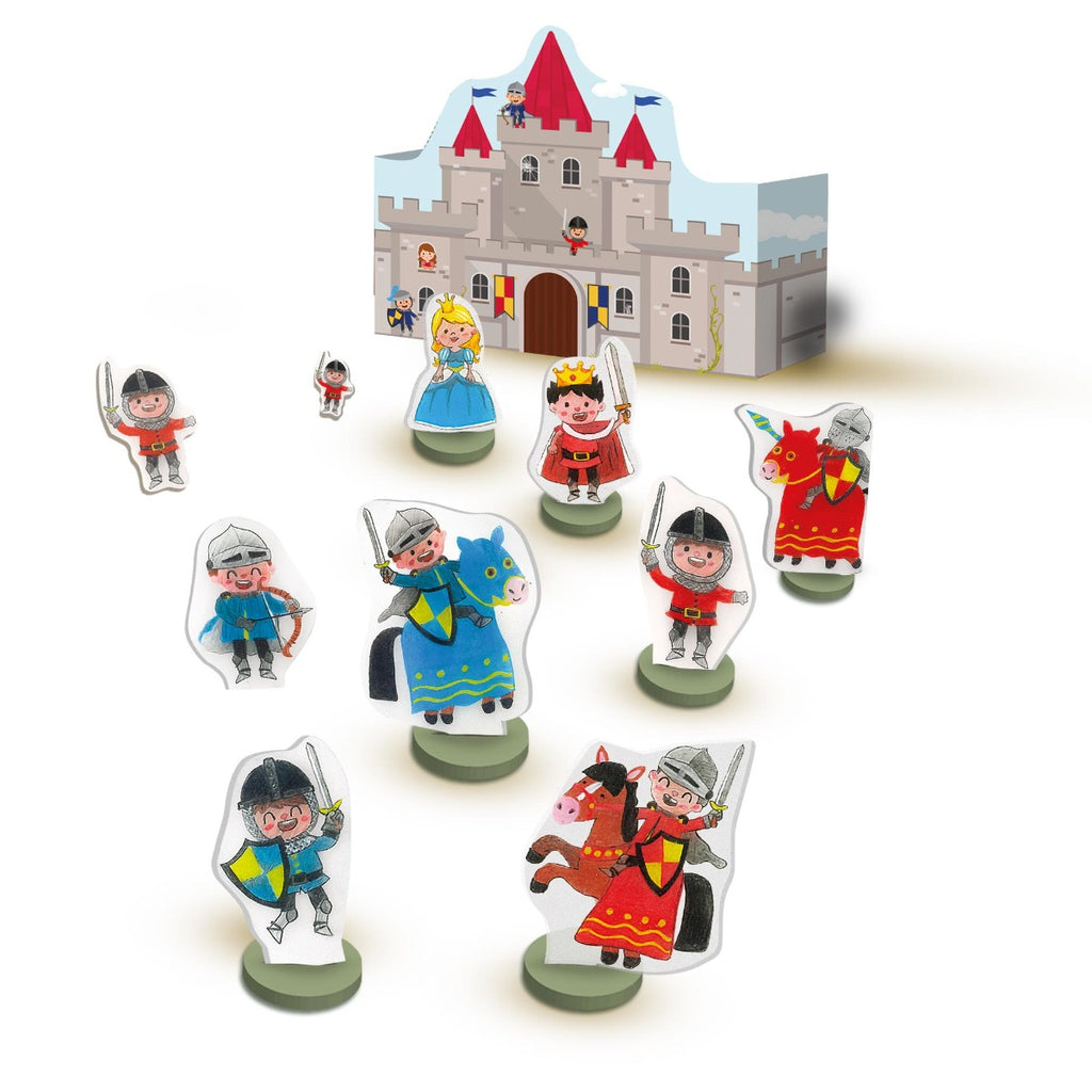 Découvre la magie du film rétractable ! Ce kit comprend tout le nécessaire pour confectionner ton propre château et même des chevaliers. Trace les exemples, colorie-les et place-les dans un four chaud. Waouh ! Regarde comme tes créations rétrécissent vite. Elles sont prêtes ? Alors mets toutes tes créations dans les supports en mousse inclus, mais où est le château ? Tu peux facilement le découper dans l’emballage.