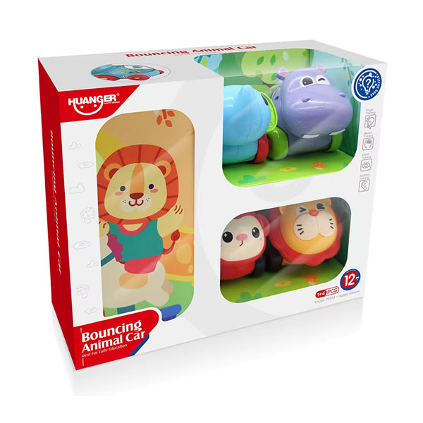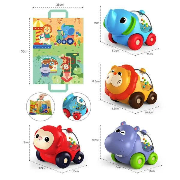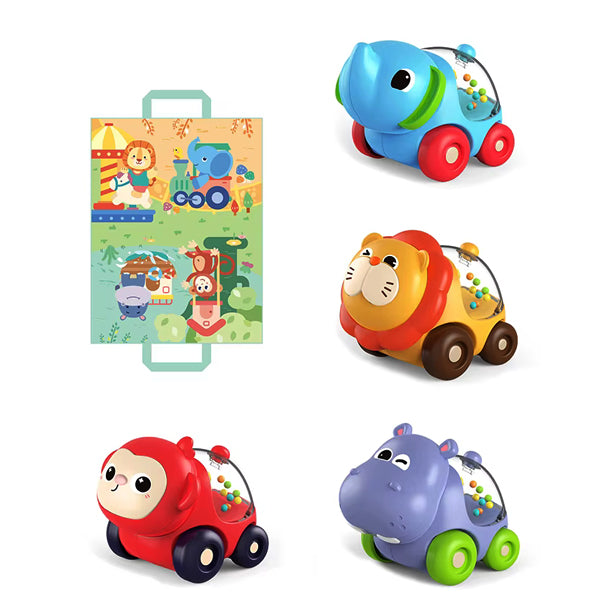 Ce set HUANGER comprend 4 petites voiturettes colorées qui font du bruit quand on les secoue, accompagnées d’un tapis de jeu doux et d’un sac pratique pour tout ranger facilement. 🌟