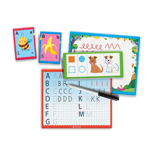 👉 L’enfant s’exerce à travers des activités progressives de prégraphisme et d’écriture de lettres et de mots, en majuscules et minuscules, en script et en cursives.