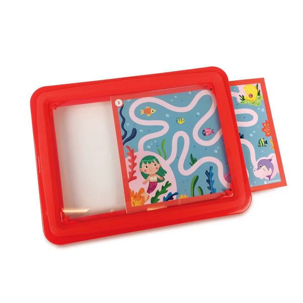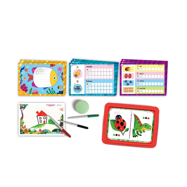 Grâce à son ardoise spéciale avec plateau transparent, son feutre et ses nombreuses fiches d’activités, les petits s’initient au pré-graphisme et à la pré-écriture de façon simple et ludique.